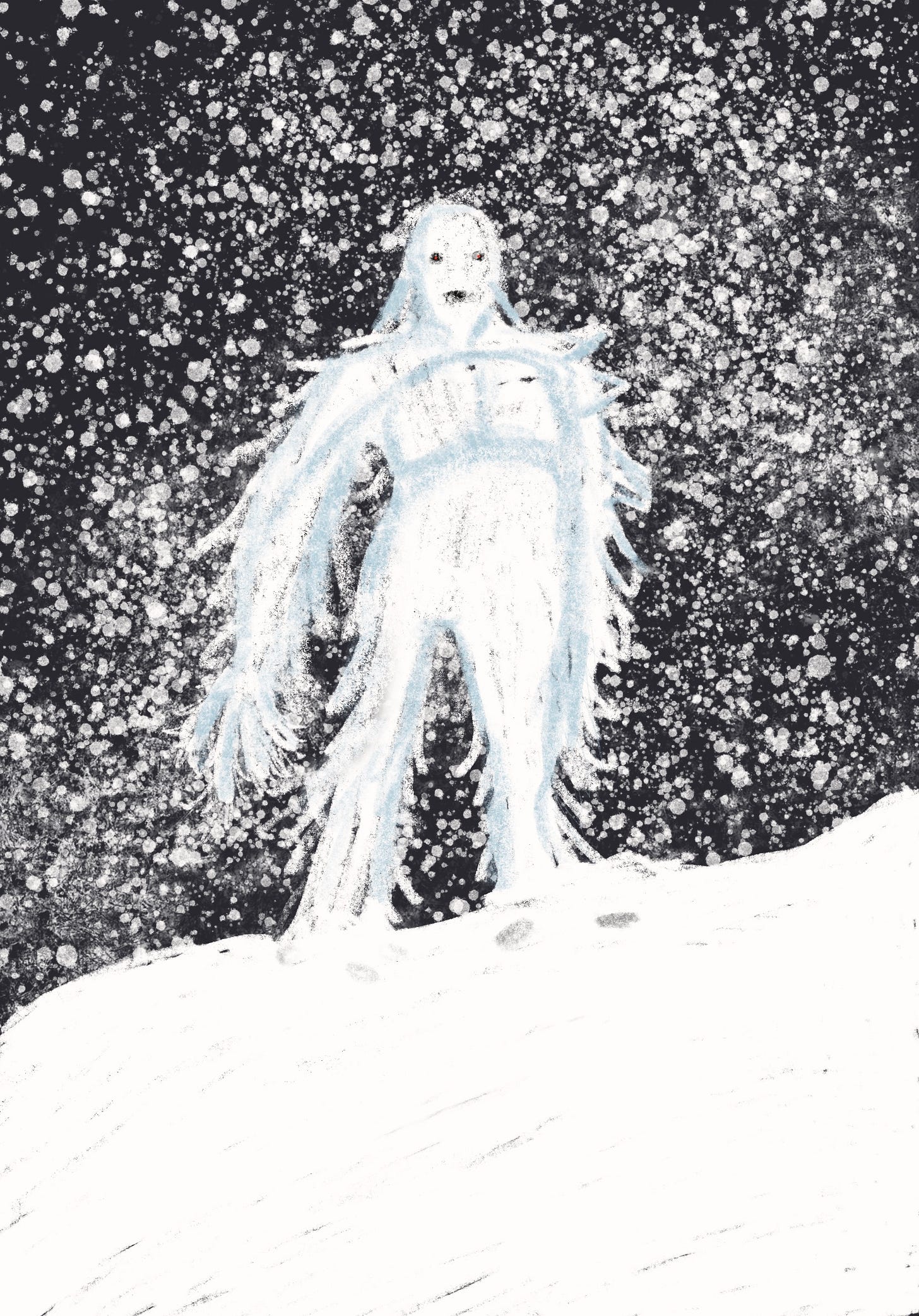 I heard my son talking about the blizzard yesterday and for a brief moment, thought he said “blizzer.” This would be right in line with other names and characters created in the Auggie-verse, so I quickly imagined a snow creature: yeti-like, yet wispier and benevolent, despite encompassing it’s surrounds with debilitating amounts of wind and snow…a symbolic force of nature.